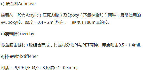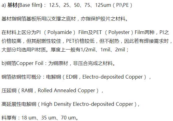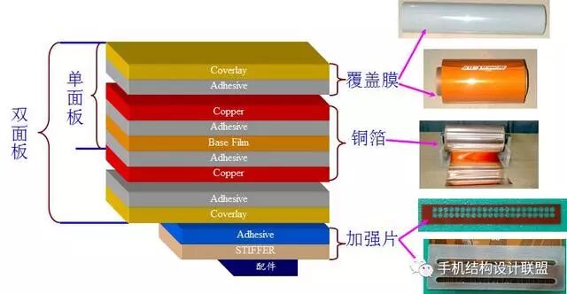 FPC是手机及其他通讯产品中常见的一个物料,谈谈我对FPC的认知: 一、FPC 产品简介——概念 FPC是英文Flexible Printed Circuit的简称。是一种铜质线路印制在PI聚酰亚胺(Polyimide)或PE聚脂(Polyester)薄膜基材上,具有可自由弯曲和可挠性,纤薄轻巧、精密度高,可以有多层线路,并于板上贴芯片或SMT 芯片。台湾称其为“软性印刷电路板”,简称为“软板”,其它名称如“可挠性线路板”,“软膜”,“柔板”等; 二、FPC优势 1.体积小,重量轻 2.配线密度高,组合简单 3.可折叠,做3D立体安装 4.可做动态挠曲 三、FPC产品结构组成 三、FPC 材料组成及规格 其应用及比较整理如下: 四、FPC类型 五、FPC工艺流程介绍 以双面板为例,大致流程如下: 六、结构设计要点